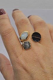 Anel ajustável , com banho de ouro, onix, pedra lua e quartzo rutilo.