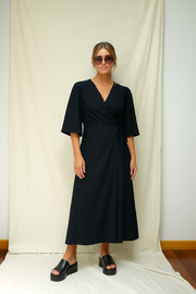 Vestido traçado envelope, em Linho, com bolsos e 3 botões de ajuste de medida no interior.