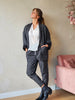 Blazer Amelie, em fazenda cinza escuro, com ligeiro quadriculado.