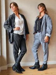 Calças Aurora, em fazenda cinza claro, com ligeiro quadriculado.