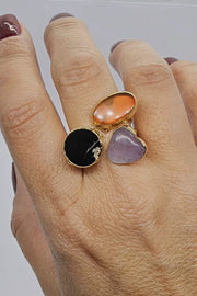 Anel ajustável, com banho de ouro, com ônix, ágata castanha, e ametista.